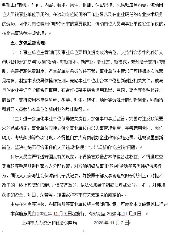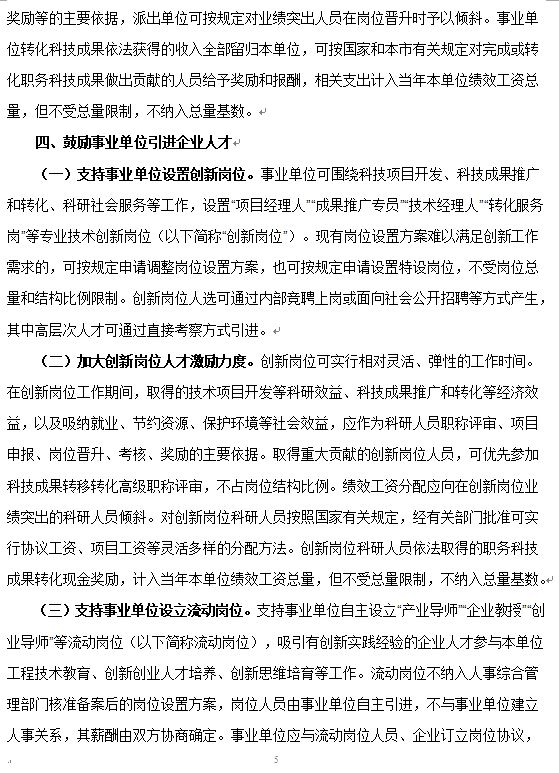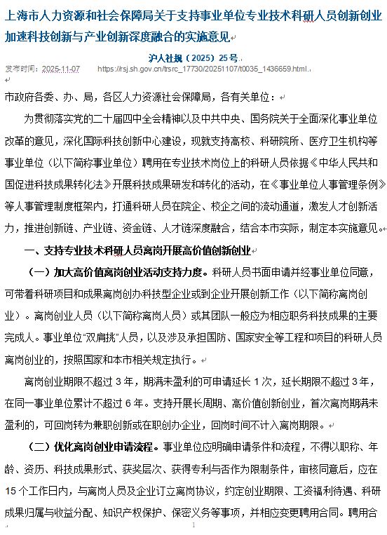 上海市支持事业单位专业技术科研人员创新创业 加速科技创新与产业创新深度融合的实施意见